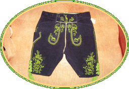 Traditional Bavarian leather trousers ("Plattlerhosen") are always on stock, each size in several colours of embroidery.